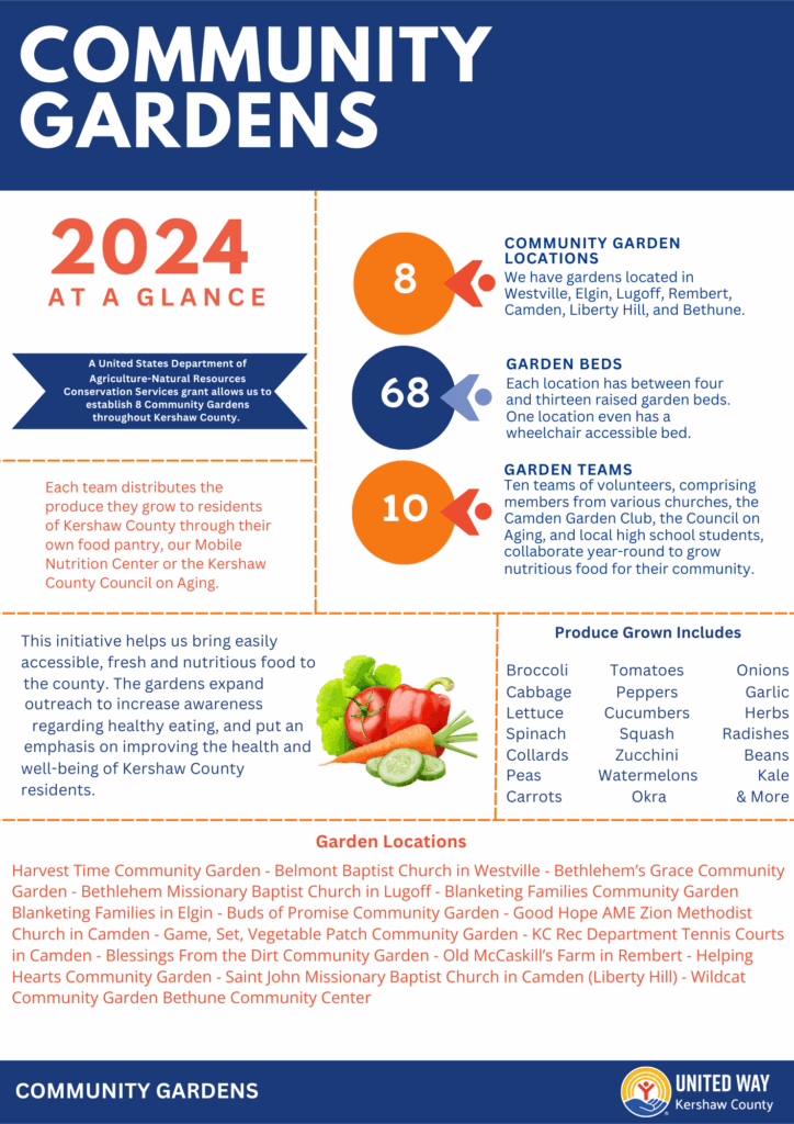 Thanks to a grant from the United States Department of Agriculture – Natural Resources Conservation Service (USDA-NRCS), we have established 8 Community Gardens across Kershaw County. This initiative brings fresh, nutritious, and easily accessible food directly to residents—especially in underserved areas.