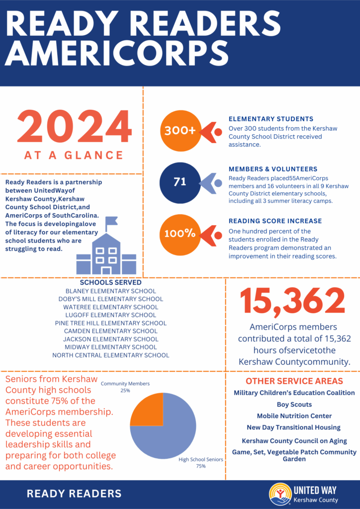 Ready Readers is a partnership between United Way of Kershaw County, Kershaw County School District, and AmeriCorps of South Carolina dedicated to building a love of reading in elementary school students who are struggling with literacy.